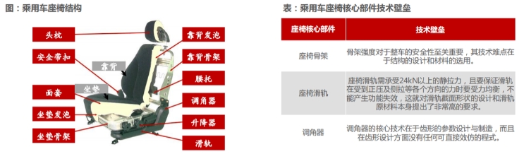 在乘用车座椅的成本构成中,核心件(骨架、滑轨和调角器)大约占制造成本的32%(骨架占比达15%,对应市场200亿左右,单车价值量约为500-800元)。此外,占比较大的是面套25%。